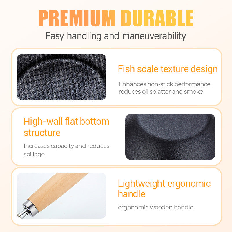 CONCEPTION DE TEXTURE EN ĂCAILLES DE POISSON ANTIADHĂSIVE  â Les parois intĂ©rieures et le fond de la poĂȘle prĂ©sentent un motif unique en Ă©cailles de poisson qui amĂ©liore les performances antiadhĂ©sives, rĂ©duit les Ă©claboussures d'huile et la fumĂ©e et assure une cuisson uniforme.