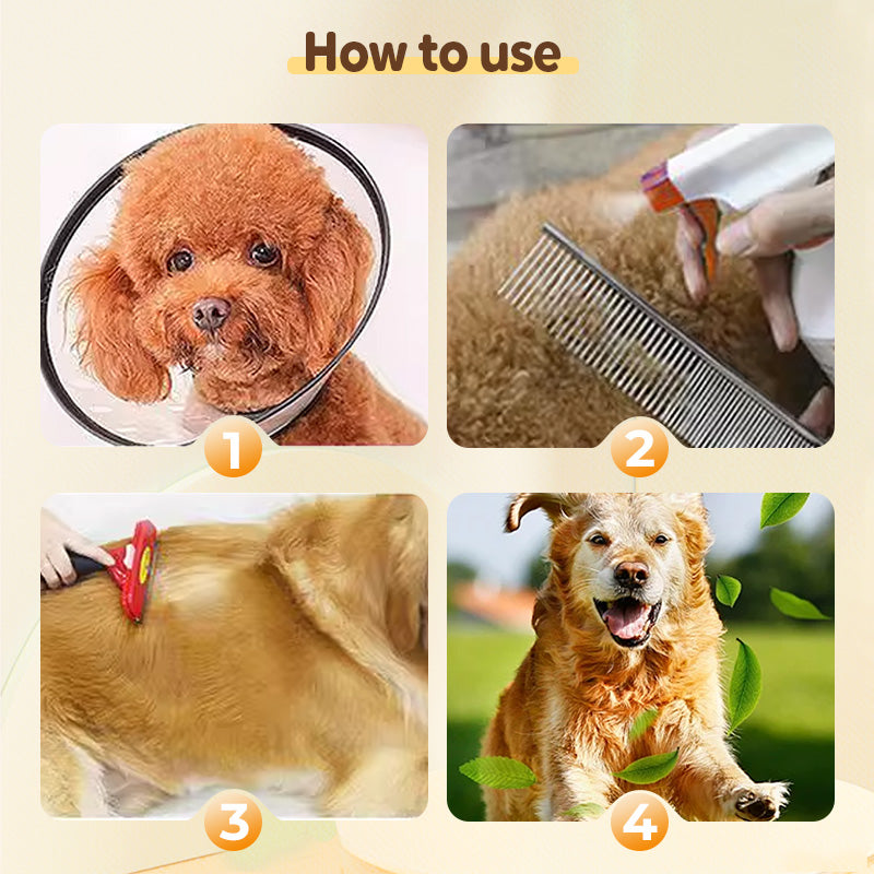 APPLICATION RAPIDE, FACILE ET SANS DÉGÂTS : Il suffit de vaporiser directement sur le pelage de votre animal – aucun rinçage ni étape compliquée nécessaire. La formule légère sèche rapidement et uniformément, ce qui la rend pratique pour les propriétaires d'animaux occupés.