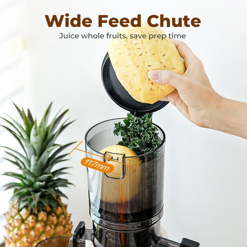 LARGE GORGES DE CHARGEMENT DE 117 MM - Pressez des fruits entiers comme les pommes et les poires sans prédécoupe. Cette fonction vous fait gagner un temps de préparation précieux le matin, rendant votre routine de jus quotidienne plus rapide et plus pratique.