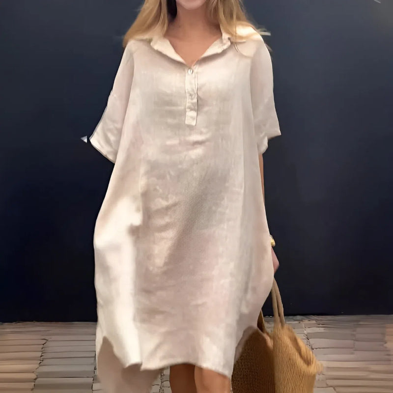 COUPE CONFORTABLE ET SURDIMENSIONNÉE - Conçue pour un confort ultime, cette robe présente une silhouette décontractée qui se drape élégamment sur le corps, permettant une aisance de mouvement et une ambiance décontractée.
