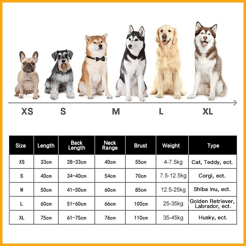 en 5 tailles du XS au XL, il convient aux chiens et chats de petite, moyenne et grande taille. Le cou et la poitrine sont réglables pour mieux couvrir le corps de l'animal.