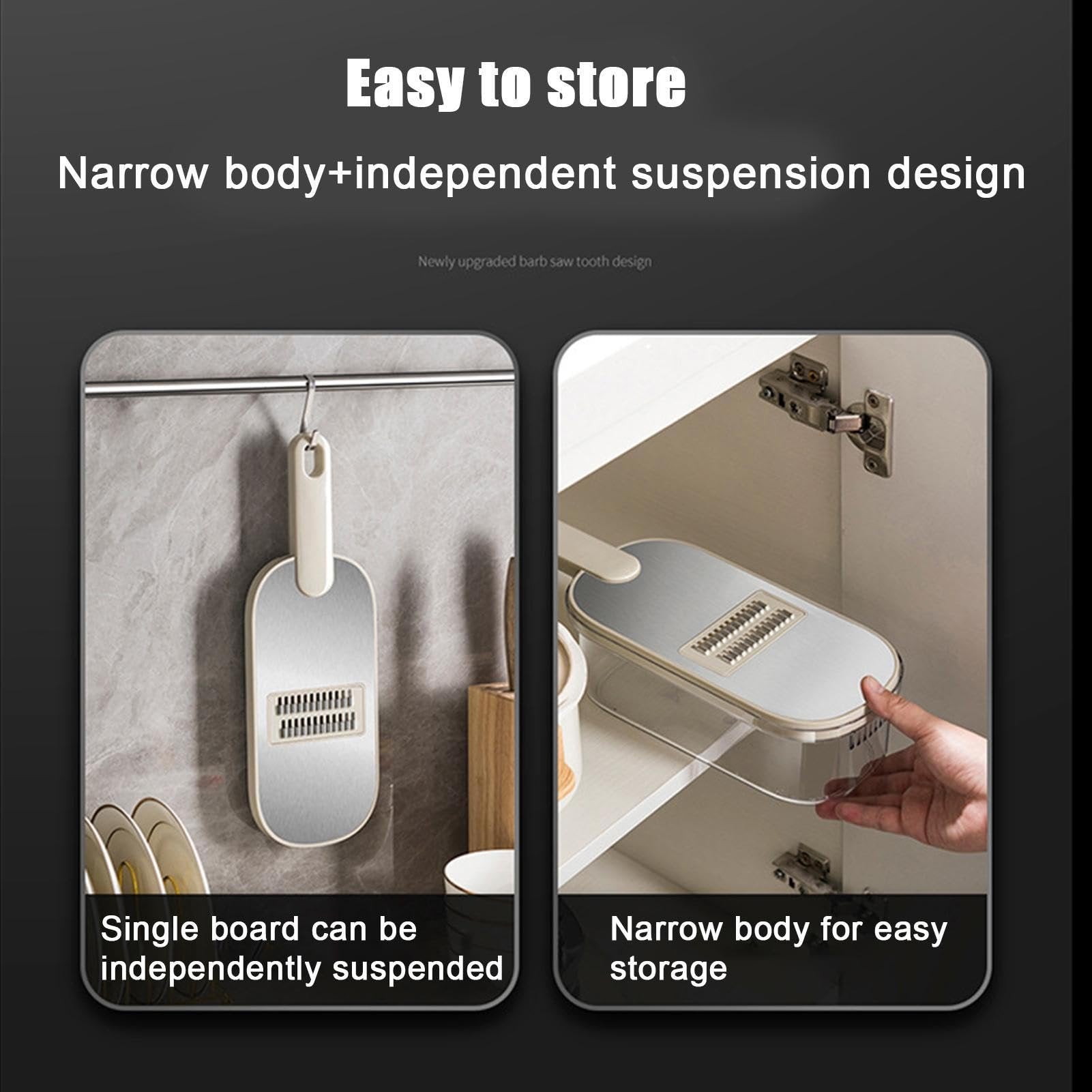 Organisation pratique : Notre mandoline multifonctionnelle dispose d'une boîte de rangement avec des lames indépendantes, qui peuvent être facilement remplacées pour une hygiène optimale. L'appareil a des lames amovibles et peut être suspendu pour sécher.